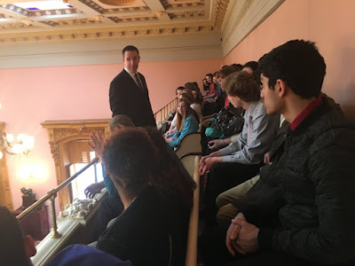 | Students talk with Representative Butler before hand-delivering their draft legislation to him during their visit. |